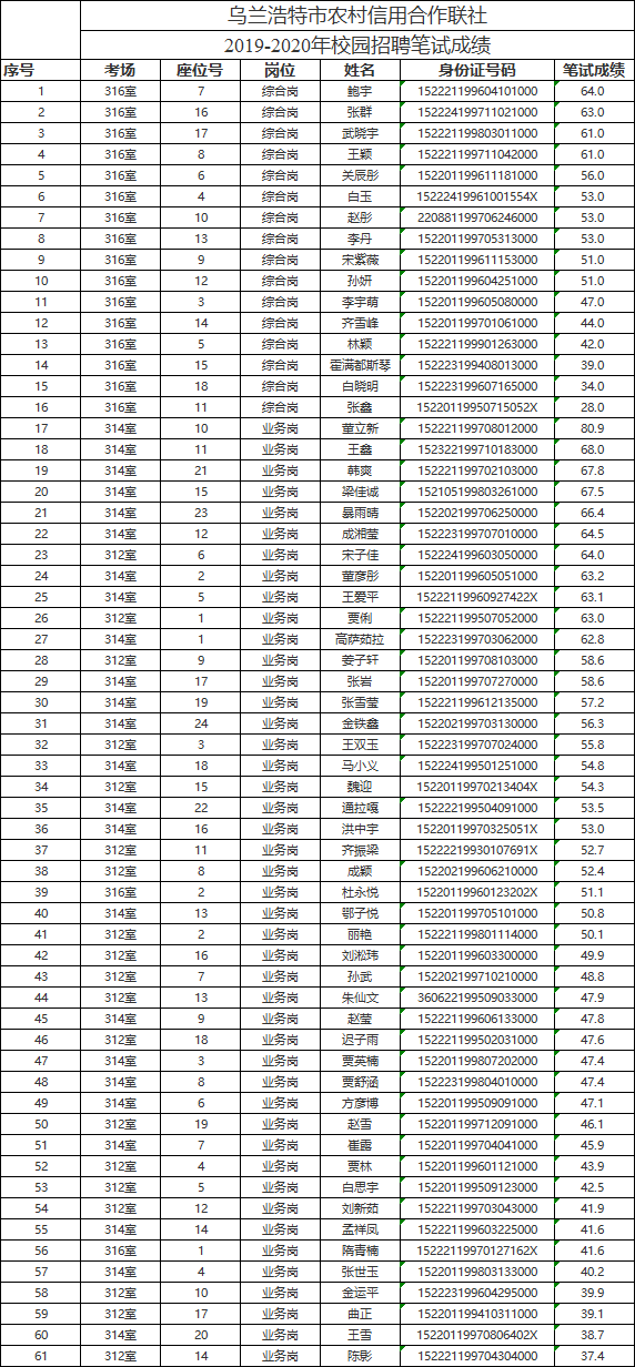 附件:烏蘭浩特市農(nóng)村信用合作聯(lián)社2019-2020年校園招聘筆試成績(jī)