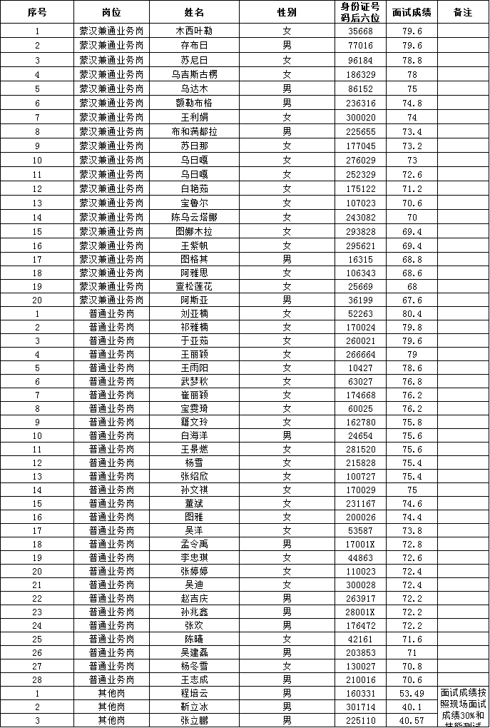 克什克騰農(nóng)商銀行委托內(nèi)蒙古如保誠人力資源管理有限公司組織完成了本行2019-2020年應(yīng)屆高校畢業(yè)生校園招聘面試工作,本次面試最終共61人參加,其中蒙漢兼通業(yè)務(wù)崗考生24人、普通業(yè)務(wù)崗考生34人、其他崗籃球?qū)I(yè)3人。根據(jù)首次開考比例須達(dá)到招聘計(jì)劃1:3的比例要求,最終確定招聘蒙漢兼通業(yè)務(wù)崗8人、普通業(yè)務(wù)崗11人、其他崗籃球?qū)I(yè)1人。根據(jù)自治區(qū)聯(lián)社文件要求,結(jié)合本行實(shí)際招聘崗位計(jì)劃,在面試結(jié)束后按照招聘崗位的1:2.5的比例確定入圍筆試人員,現(xiàn)將入圍筆試人員名單及成績進(jìn)行公告。