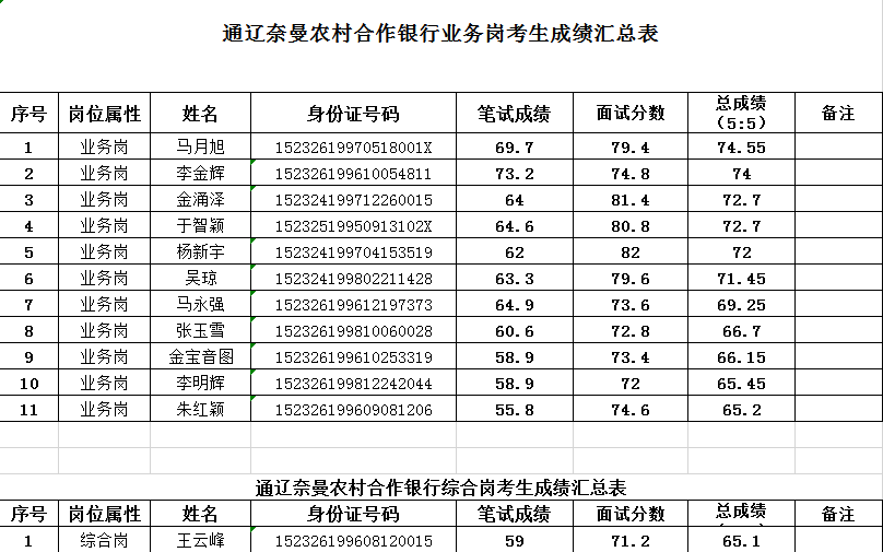 根據(jù)《內(nèi)蒙古自治區(qū)農(nóng)村信用社聯(lián)合社關(guān)于落實“凡進必考”要求、從嚴規(guī)范做好2019-2020年度應屆高校畢業(yè)生校園招聘工作的通知》(內(nèi)農(nóng)信發(fā)〔2019〕765號)要求,通遼奈曼農(nóng)村合作銀行于2019年11月30日-12月2日,完成校園招聘筆試、資格審核及面試工作,根據(jù)筆試與面試成績5:5加權(quán)計算總成績,各崗位按照招聘計劃1:1比列最終確定12人入圍實習,其中業(yè)務崗11人、綜合崗1人?,F(xiàn)將入圍人員公告如下: