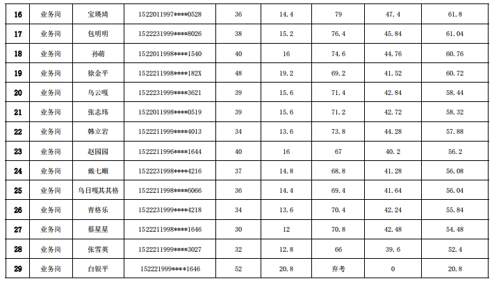 根據(jù)《內(nèi)蒙古自治區(qū)農(nóng)村信用社聯(lián)合社關(guān)于從嚴(yán)規(guī)范做好2021年轄內(nèi)法人機(jī)構(gòu)應(yīng)屆高校畢業(yè)生校園招聘工作的通知》文件的要求,科右前旗農(nóng)村信用合作聯(lián)社圓滿完成了2021年度校園招聘筆試、面試工作,現(xiàn)將綜合成績(jī)予以公告。
