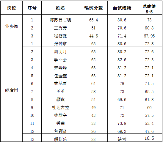 根據(jù)《內(nèi)蒙古農(nóng)村信用社2019-2020年度全區(qū)法人機(jī)構(gòu)應(yīng)屆高校畢業(yè)生校園招聘簡(jiǎn)章》要求,2019年12月2日,霍林郭勒市農(nóng)村信用合作社圓滿完成了2019-2020年度校園招聘面試工作。現(xiàn)將面試與筆試成績(jī)按照5:5比例加權(quán)計(jì)算結(jié)果予以公布。